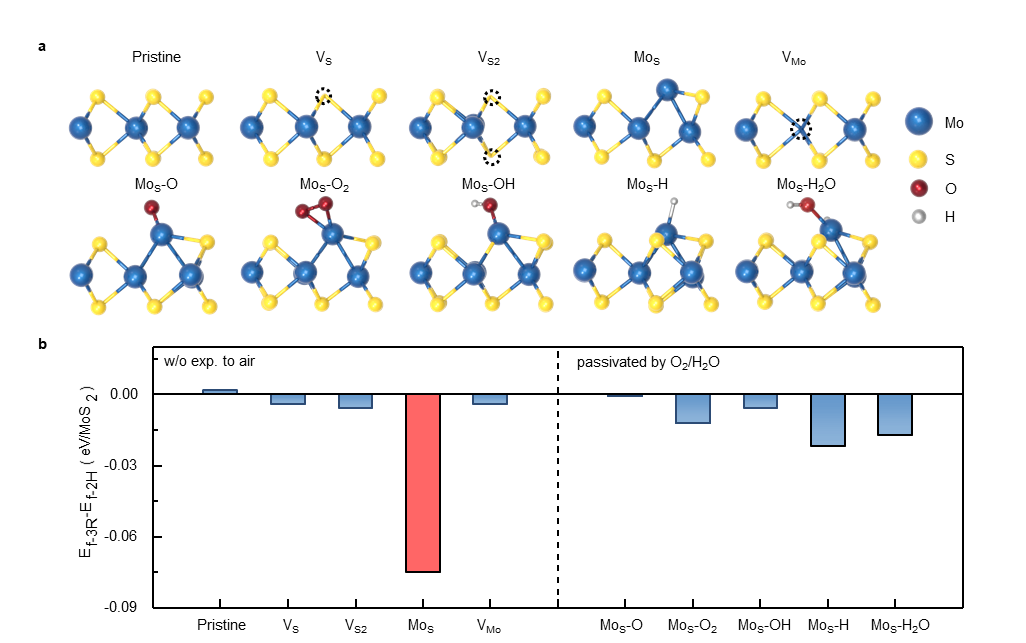为深入揭示3R相选择性形成机制,研究团队联合东南大学王金兰教授团队开展理论计算。结果表明,晶体缺陷中的Mo替位S缺陷(MoS)可将两种堆垛的形成能差值从1 meV/MoS2显著提升至75 meV/MoS2。实验上,团队聚焦形核初期阶段,采用高分辨率STEM对<10 nm的团簇进行观测,证实MoS缺陷对3R选择性生长的促进作用(图2)。基于理论与实验的交叉验证,团队提出了同质外延中的缺陷促进选择性形核的生长机制。这一理论的提出,为二维材料的结构调控提供了全新的机制与思路,为该领域的研究带来了新的突破与希望。