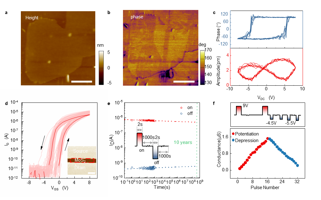 此外,该工作还深入揭示了3R-MoS2所表现出的滑移铁电性(图3)。实验利用压电力显微镜(PFM)明确观测到铁电畴及明显的压电响应回滞曲线,并构建了以双层3R-MoS2为沟道材料的超薄铁电晶体管阵列。尽管沟道材料厚度仅为1.3 nm,其仍表现出超过十年的数据保持能力、优异的电导特性以及16位多态写入能力,为未来高密度、低功耗、非易失存储器件的发展注入了新动能。