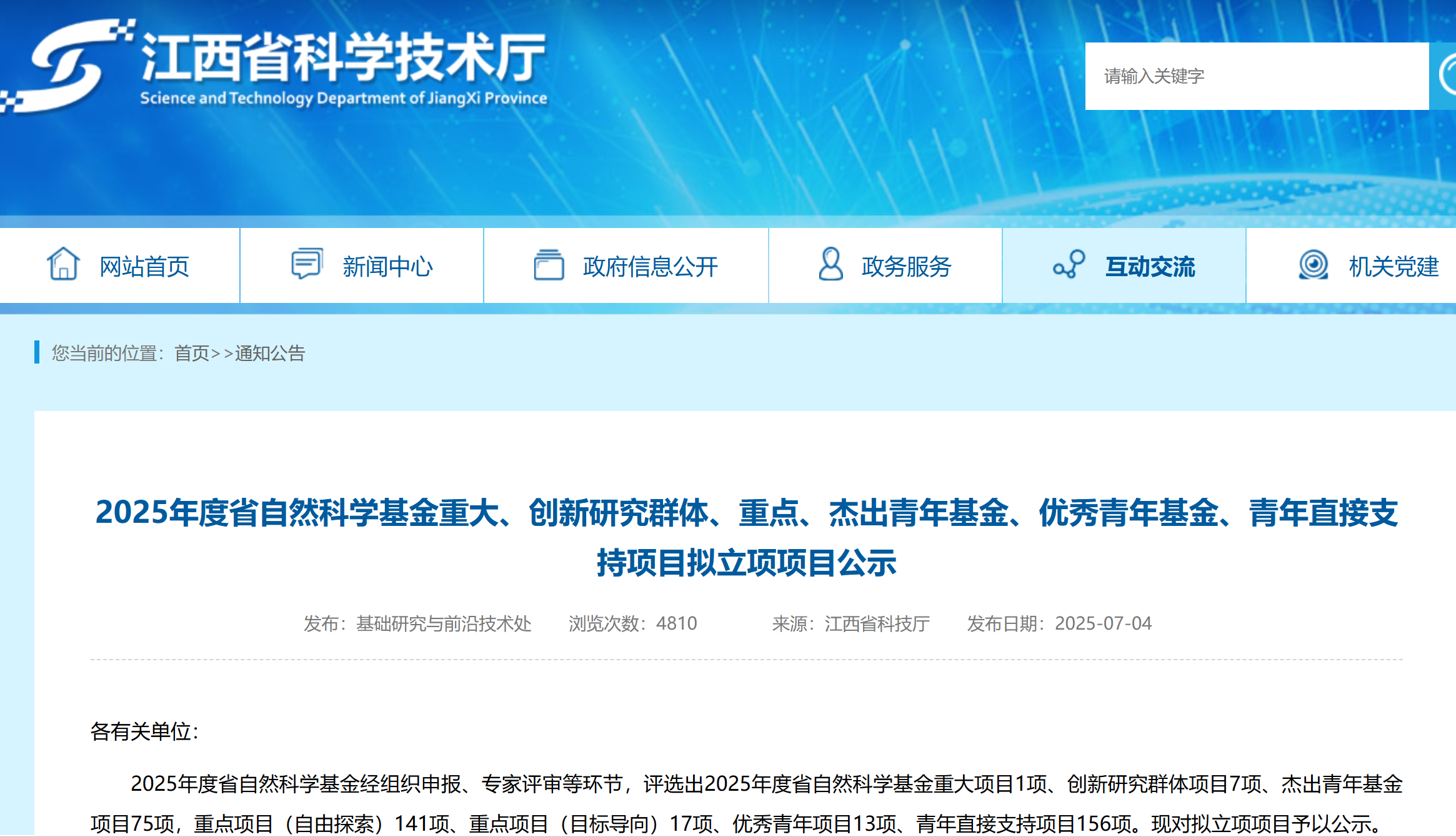 江西省重大、创新研究群体、重点、杰青、优青、青年直接支持项目拟立项项目公示。
