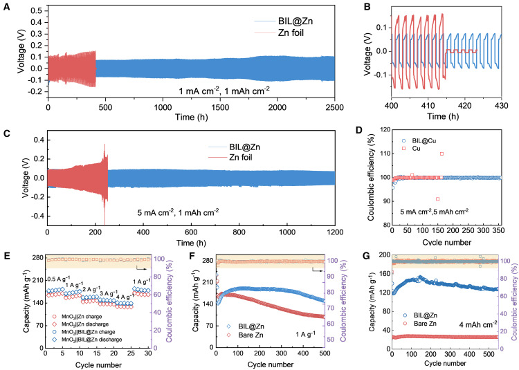 该成果受贝壳微观结构的启发,利用从天然蛭石和生物材料中提取的廉价、安全和绿色的原材料,在锌金属负极上构建了结构相似的仿生人工固体电解质界面层(Solid Electrolyte Interphase, SEI)。仿生人工SEI具有9.8 GPa的超高储能模量和超过0.5 GPa的平均硬度,在沉积过程中使锌枝晶在应力下屈服,有效地抑制了枝晶生长。此外,二维片状材料堆叠并且与生物聚合物相结合,形成选择性离子通道,可实现锌离子的高效快速传输。研究结果加深了锌负极溶解/沉积过程的力-电化学耦合认知,同时为金属负极的SEI结构设计提供了新的研究思路。