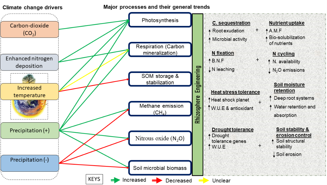 气候变化对农业生态系统关键生物地球化学过程的影响,以及根际工程在缓解土壤-植物-环境系统冲击中的作用机制。