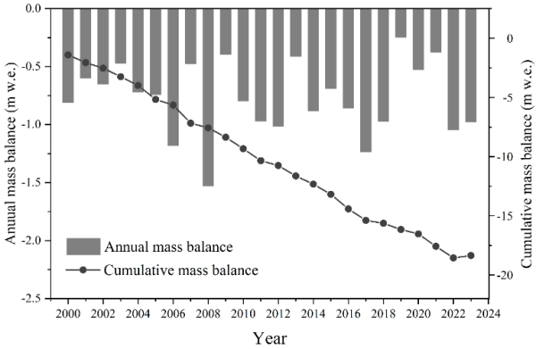 研究团队选用全分量分布式能量平衡模型,以2015年来逐年物质平衡实地观测数据和2000年来每5年间隔大地测量法获取的物质平衡变化作为验证,模拟重建了2000年至2023年物质平衡逐年序列,通过误差评估和不确定性分析,明确了研究结果的可靠性。