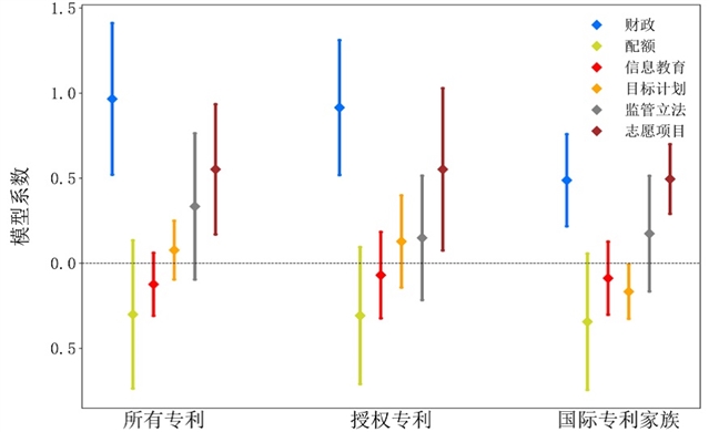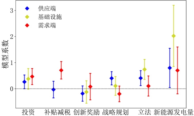 研究结果表明,财政类政策,特别是补贴政策的效应十分显著,能够有效推动技术创新和产业发展,但存在明显的边际效应递减和刺激产业无序扩张风险。对于风能,财政类政策作用主要集中在普通创新(从所有专利到国际专利家族,系数从0.966下降到0.488,见图1),表现出明显的边际效应递减,说明过度的财政补贴仅刺激了一般创新数量增长,并未同步刺激高价值创新和行业高质量发展,过度补贴易导致产业无序扩张。对于氢能,补贴政策表现出高度的技术成熟度敏感性。如对于技术成熟度低的需求端,补贴通过缩小新能源与化石能源之间的成本差距,加速氢能的渗透,促进需求增加和潜在市场扩张进而刺激技术创新,系数为0.707且在1%水平显著;但对于技术成熟度高的供应端,政策效应不显著,补贴并未刺激创新增长反而易刺激产业无序扩张(见图2)。