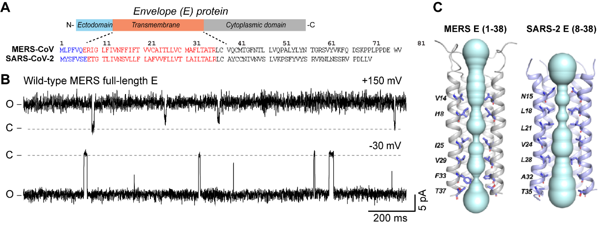 严重急性呼吸综合征冠状病毒(SARS-CoV-1)、新型冠状病毒(SARS-CoV-2)和MERS-CoV是3种高致病性的冠状病毒。前两者的E蛋白已被证实为阳离子通道,在中性pH下易形成紧密的五螺旋束,构成不透水的孔道,而在酸性和钙离子条件下,E蛋白跨膜域中间的3个苯丙氨酸残基会旋转到脂质一侧,从而打开离子通道。然而,MERS-E蛋白的结构特征与通道属性尚不清晰。