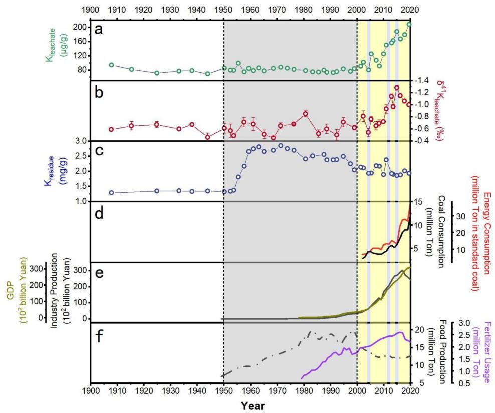 团队研究结果表明,湖泊沉积物残渣K(Kresidue)主要来自流域基岩侵蚀,淋滤态K(Kleachate)则受燃煤等化石燃料输入的强烈影响,且表现出显著的时代特征。