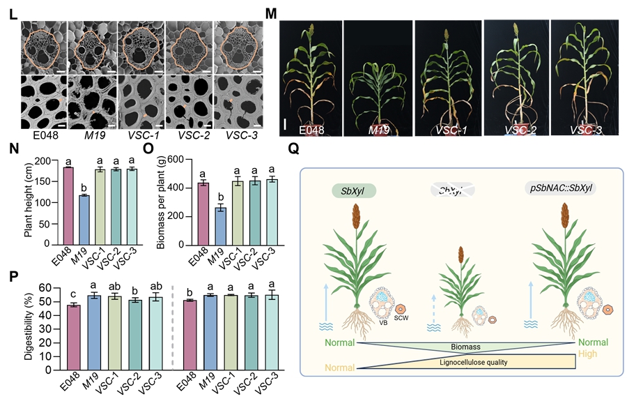 为破解突变体品质与生物量负相关的难题,研究团队开发了维管组织特异互补(VSC)策略。通过同源基因比对、转录组分析和GUS报告系统确定了高粱维管组织特异表达基因SbNAC31,利用SbNAC31基因的启动子驱动SbXyl在突变体中表达。表型观察和测定结果表明,VSC转基因株系成功弥补了突变体生长发育缺陷,使得水分运输能力和生物量都恢复到野生型水平。值得一提的是,VSC株系保留了突变体优异饲料品质的特征:未青贮野生型植株消化率为47.72%,不同VSC株系的消化率为51.27%-54.03%,较野生型提高7.5%-13.2%;青贮后野生型植株消化率为51.08%,不同VSC株系的消化率为54.81%-55.12%,仍表现比野生型高7.3%-7.9%的优势。同时,VSC株系的消化率与突变体没有显著差异。