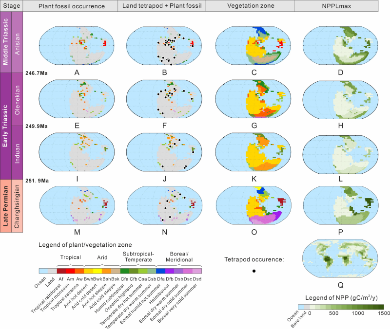 在资料库基础上,上述研究团队制定了植物化石重建与数据规范化方案,开展沉积学证据分析,并对全球陆表岩石类型及化学成分进行统计,首次绘制出二叠纪–三叠纪大灭绝前后至中三叠复苏阶段的全球陆地植被与岩性演化的时空分布。