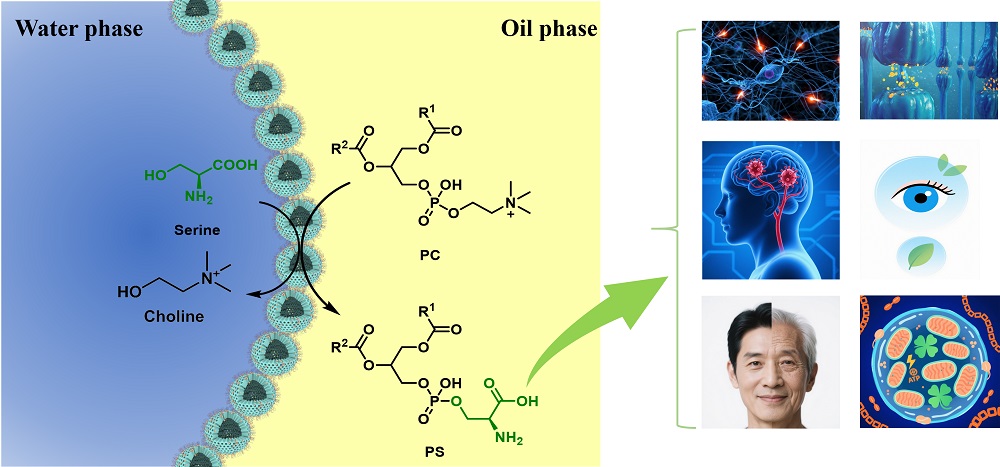 为此,科研团队创制出了活性高、专一性强的固定化磷脂酶,并构建了皮克林界面生物催化体系,在20分钟内即可实现93.8%的转化率。每升溶剂中磷脂酰丝氨酸含量可达40克,催化效率为目前报道的最高水平,为功能磷脂的高效生物合成提供了一种绿色、可持续新方法。