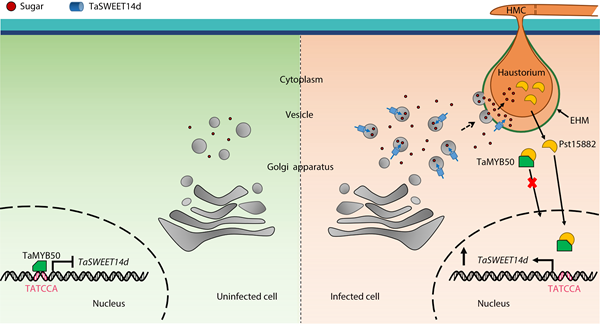 由条形柄锈菌小麦专化型(Puccinia striiformis f. sp. tritici, Pst)引起的小麦条锈病是我国小麦生产上最严重的真菌病害之一,严重威胁我国小麦的生产安全。条锈菌为严格的活体营养专性寄生真菌,需从寄主细胞获取营养物质供生长发育所需,而充足的碳源供给是条锈菌侵染致病的关键,阻断条锈菌糖分吸收能够有效提高寄主抗性。糖分摄取、交换和竞争,主要发生于病菌与寄主细胞的交界面(interface),由糖转运蛋白控制。然而,条锈菌侵染过程中如何操控寄主糖转运蛋白获取营养的调控机制尚缺乏明确的科学阐释。