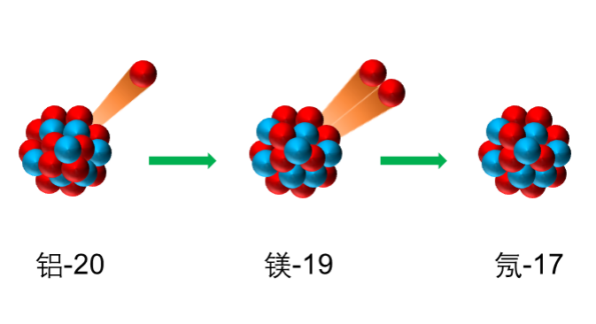 进一步的研究表明,铝-20基态通过级联的质子—双质子发射的两步过程进行衰变。作为中间态的镁-19基态具有双质子放射性,它通过同时发射两个质子衰变为氖-17。