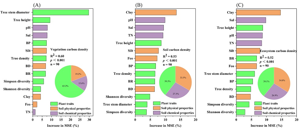 研究基于雷州半岛海岸红树林11个样带和90个样地实地调查发现,雷州半岛红树林碳密度平均为170.93t/hm2。其中,西部沿海样带D1(高桥)和D6(仕尾)达到峰值。同时,土壤与植被碳密度呈正相关,其中植被碳密度随树干直径和树高的增加而增加,随红树植物种植密度的增加而降低。研究显示,生态系统碳密度与红树科物种相对丰度呈正相关;粘土、活性铁氧化物等土壤活性矿物含量与土壤碳储量呈正相关;植被多样性对植被和土壤碳密度均有促进作用,特别是在高潮间带。