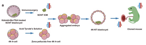 此项研究中,研究团队通过对体细胞克隆胚胎施以组蛋白去乙酰化酶抑制剂曲古抑菌素A (TSA)处理,同时向胚胎中注射编码H3K9me3去甲基化酶Kdm4d和H3K4me3去甲基化酶Kdm5b的mRNA干预异常组蛋白修饰,有效解决了体细胞克隆胚胎着床前发育表观遗传障碍。同时,利用四倍体补偿技术替换了克隆胚胎的滋养层细胞,有效处理了克隆胚胎胎盘组织中非典型基因印记缺失问题,从而解决了体细胞克隆胚胎着床后发育表观遗传障碍。通过这种组合体细胞克隆胚胎表观遗传障碍干预技术策略,实现了体细胞克隆小鼠移植胚胎约30%的出生率。