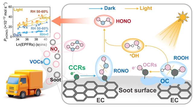 亚硝酸非均相生成机制研究取得进展。 亚硝酸(HONO)是大气中重要的含氮污染物,作为羟基自由基(•OH)的主要前体物,还会影响大气的氧化能力、加速二次污染的形成。近年,环境持久性自由基(EPFRs)在亚硝酸生成过程中的作用机制受到广泛关注。作为一种广泛存在的活性组分,EPFRs可在大气颗粒物中长期稳定存在,其中具有较高反应活性的碳中心自由基,不仅促进活性氧物种(ROS)生成,还参与二氧化氮(NO2)非均相反应,加速亚硝酸的生成。柴油车排放的烟炱(Soot)是城市大气中EPFRs的重要载体(浓度约1015–1017 spins·m-3)。既往研究发现烟炱中的有机碳和元素碳共同影响亚硝酸的生成,但二者的协同作用机制及真实环境条件下烟炱中EPFRs参与HONO生成的反应路径和速度仍存在认知空白。