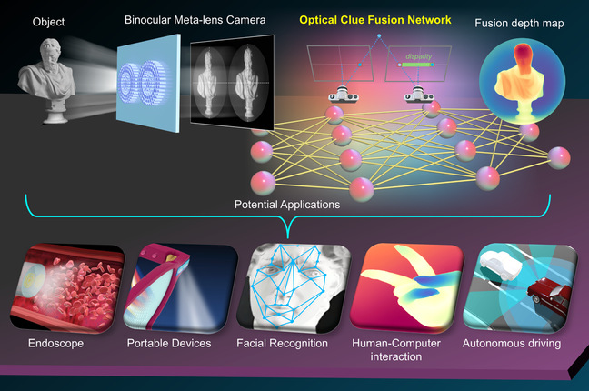 三维成像技术在自动驾驶、医学诊断及工业检测等领域中具有重要应用价值。传统的三维成像方案普遍存在系统体积大、结构复杂、精度有限等问题,难以满足现代视觉系统对小型化、高性能的迫切需求。近年来,纳米光子学的发展促生了超透镜等新型光学器件,使得三维成像设备更加紧凑。如何突破复杂场景下的深度估算精度瓶颈,成为当前研究热点。