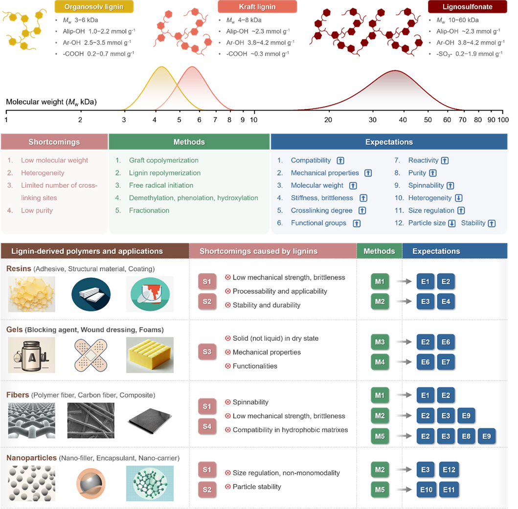 原文图 7 常见工业木质素的特性及针对木质素基聚合物材料应用性能提升思路