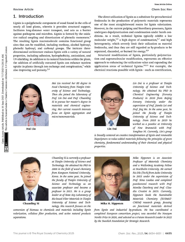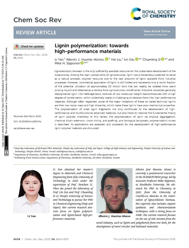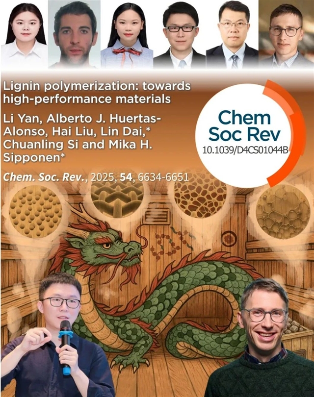 近日,天津科技大学戴林/司传领团队联合瑞典斯德哥尔摩大学 Mika H. Sipponen 团队提出了一种颠覆性的观点,即通过提高木质素的分子量解决工业木质素分子量小等问题,完善木质素高分子化学基本理论,拓展木质素在先进复合材料领域的规模化、高值化应用。该工作以题为Lignin polymerization: towards high-performance materials发表在《Chemical Society Reviews》2025年7月第54卷14期,并被遴选为正封面文章(Front cover)。天津科技大学博士研究生闫莉为第一作者,天津科技大学戴林/司传领、斯德哥尔摩大学Mika H. Sipponen为共同通讯作者,天津科技大学为第一单位,欢迎下滑阅读了解更多