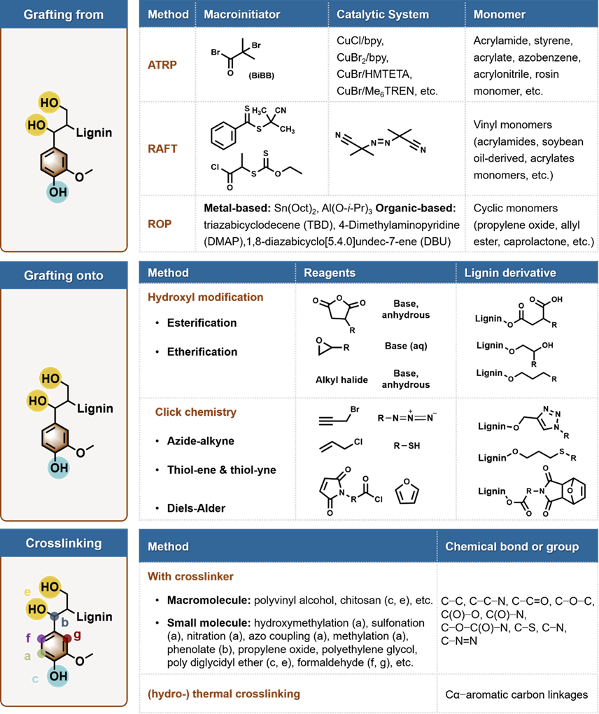 原文图 5 化学接枝、化学交联等实现木质素聚合路径