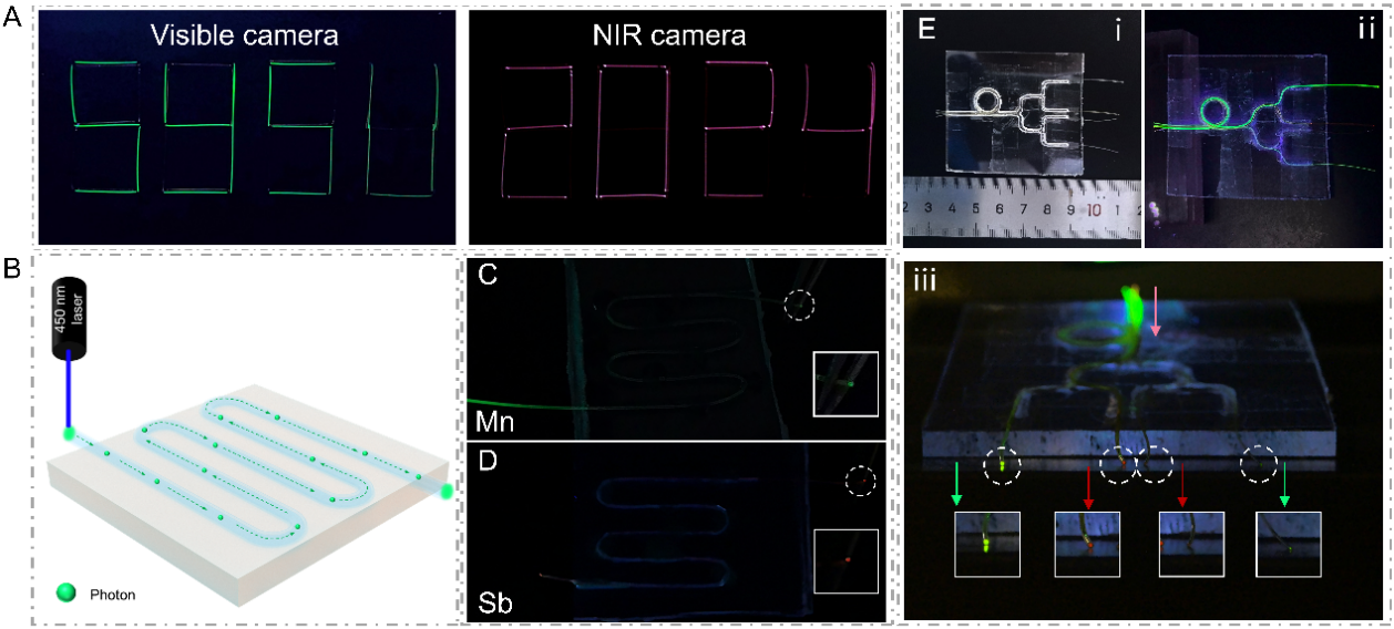 匡代彬教授团队合成了(HTPP)2MnBr4和(HTPP)2SbBr5玻璃,发展了低温(230℃)熔融填充技术,将(HTPP)2MnBr4或(HTPP)2SbBr5熔体填充到聚四氟乙烯管(PFA)内,成功制备出OIMH/PFA芯包结构光纤。OIMH玻璃光纤呈现出低传输损耗(Mn基0.41 dB/cm,Sb基0.16 dB/cm)与优异机械性能(弯曲半径≤0.8 mm无开裂);以及双模式操作(适用于主动和被动波导功能)的功能。利用这些OIMH玻璃光纤的机械柔韧性可以编织成不同图案,并利用OIMH的发光特性实现光学加密和图案警示。同时,利用OIMH玻璃光纤低的弯曲损耗可以构建光回路展示可靠的光信息传输的能力。该工作不仅为柔性光电器件开发提供了材料平台,而且有望推动有机-无机杂化金属卤化物玻璃光纤在光学加密系统、内窥镜照明、可穿戴传感器、智能织物、光子芯片等前沿领域的创新应用。