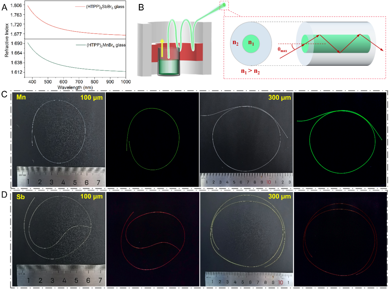 新一代光波导介质需要同时集成超低光损耗、优异机械柔韧性及双模式光子管理能力(兼具自发射与外源输入的被动传输功能)。尽管基于改性化学气相沉积(MCVD)和管内熔体技术制备的量子点掺杂光纤已取得进展,但仍面临量子点聚集引发的散射损耗以及二氧化硅/聚合物基体不相容等瓶颈问题。此外,单晶波导虽然可提供亚微米级光学约束,但其各向异性生长特性与环境敏感特性限制了实际应用。近几年报道的有机-无机杂化金属卤化物(OIMH)玻璃凭借独特的发光特性与热力学性能有望解决上述难题,可为开发兼具低传输损耗、高柔韧性和双模式操作的光纤提供关键材料。