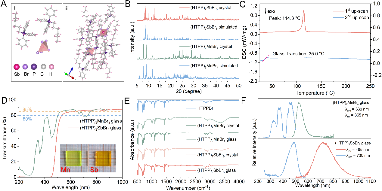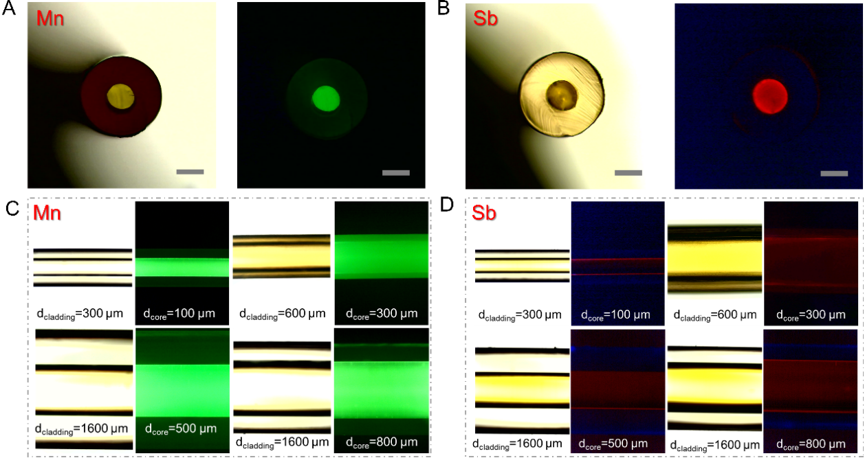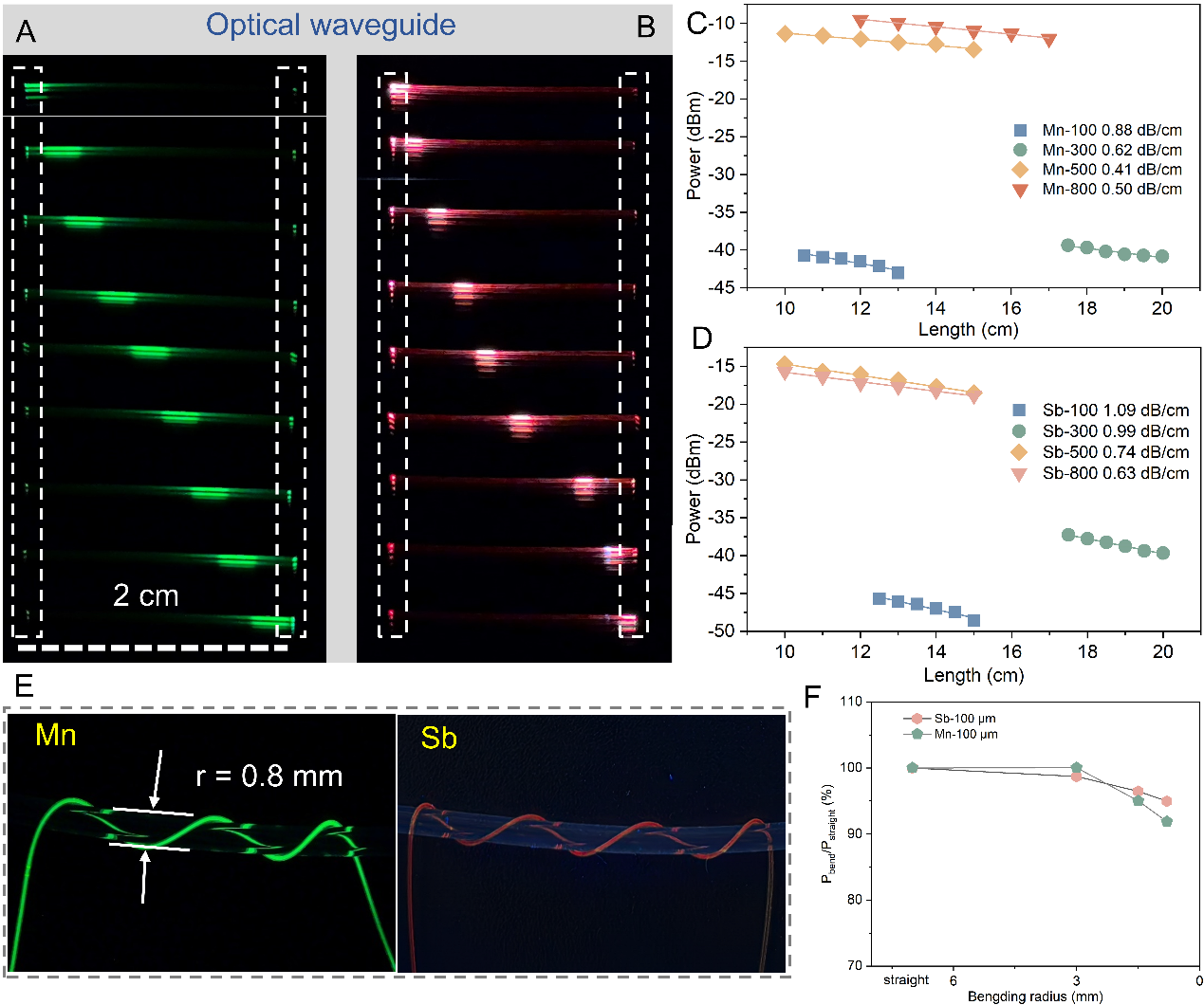 该工作报道了一种在低温(230℃)下通过熔体填充的策略来制备具有芯包结构的有机-无机杂化金属卤化物(OIMH)玻璃光纤。其中,二(己基三苯基鏻)四溴化锰(II) ((HTPP)2MnBr4 (HTPP = hexyl triphenylphosphine))光纤的传输损耗低至0.41 dB/cm,二(己基三苯基鏻)五溴化锑(III) ((HTPP)2SbBr5)光纤的传输损耗低至0.16 dB/cm。这些光纤具有出色的机械柔韧性(弯曲半径≤0.8毫米),在光学加密和集成光子学领域显示出了巨大的应用前景。