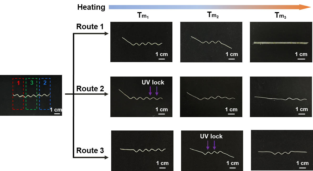 另一方面,凝胶中含有的二硫键可在紫外光下引起动态键交换过程,释放内应力,使得材料被固定于相应形状,且可实现区域控制。如图3所示,这个过程使得形状的变化路径不再是预先确定的,而是可以根据需求灵活调整。