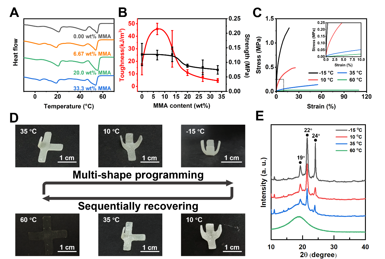 该工作构建了含动态二硫键的聚合物网络,并利用非挥发性脂肪酸混合物对其进行溶胀,形成具有多重形状记忆特性的高分子凝胶。通过调节脂肪酸的熔化顺序:10 °C(辛酸)→ 35 °C(月桂酸)→ 60 °C(硬脂酸),能够在不同温度下实现多阶段的形状回复。