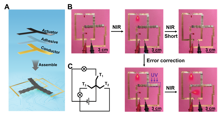 基于上述研究,作者设计并制造了带有自纠错功能的电路开关。该器件由三层结构组成:凝胶驱动层、粘附层与导电层。三条悬臂分别预编程了不同的恢复温度(-15 °C、10 °C和35 °C)。NIR照射时,中臂首先舒展点亮第一盏灯。随着持续光照加热,右臂开始舒展导致短路。利用路径控制,作者采用UV光照可抑制右臂变形,从而消除短路的可能,规避电路故障。随后,切换NIR,驱动左臂点亮第二盏灯。这种基于实时形变干预的纠错机制,在材料层面实现了电子器件的主动安全防护,展现出所建立机制对材料的灵活调控能力。