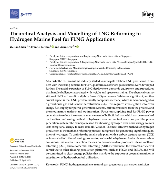 关于海上 FLNG 平台未来的制氢研究,考虑采用蒸汽甲烷重整(SMR)和自热重整(ATR)相结合的混合技术,有望实现成本和能耗的降低。将其与可再生电力整合(例如电解 + ATR),则可能进一步提升可持续性。在征收碳税的环境下,碳捕集技术的改进将决定 SMR 是否仍能与 ATR 保持竞争力。