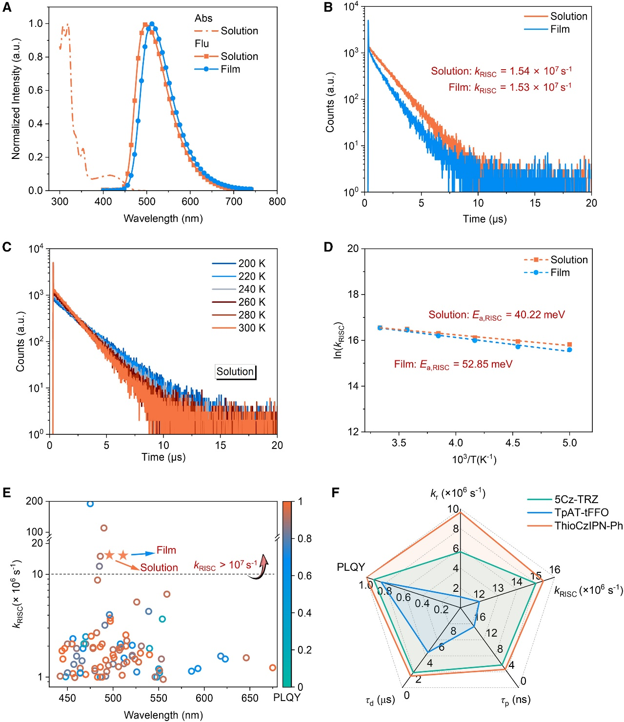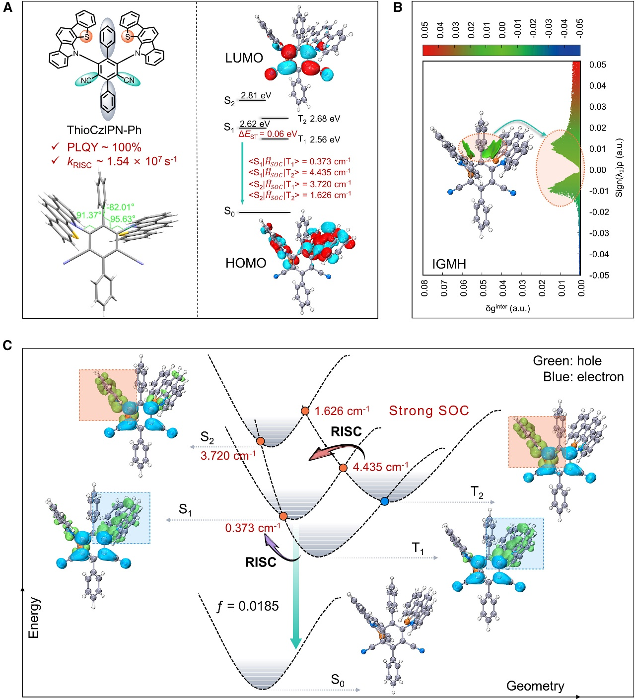 在这项工作中,作者设计的TADF材料(ThioCzIPN-Ph)采用给体-受体-给体的结构,通过理论计算分析发现,其S1与T2态为具有近似对映特性的电荷转移态跃迁,且能级接近。这一特性使材料巧妙地规避了El-Sayed规则对于自旋翻转过程(特别是涉及相似CT态间跃迁)的限制。同时,分子结构中引入硫原子,利用其重原子效应进一步增强了SOC。这两种机制的协同作用,使S1与T2间SOC常数(<S1HSOCT2>)高达4.435 cm-1,进而在SVC的帮助下有效加快RISC过程。ThioCzIPN-Ph在溶液和掺杂薄膜中均实现了快速的RISC过程,速率分别为1.54 ×107s-1和1.53 ×107s-1,同时保持了接近100%的光致发光量子产率(PLQY)。值得注意的是,ThioCzIPN-Ph在实现快速kRISC的同时,其辐射跃迁速率(kr = 0.965 ×107s-1)也表现优异,进而将其延迟荧光寿命有效缩短至1.46 μs,加速了激子的利用效率。