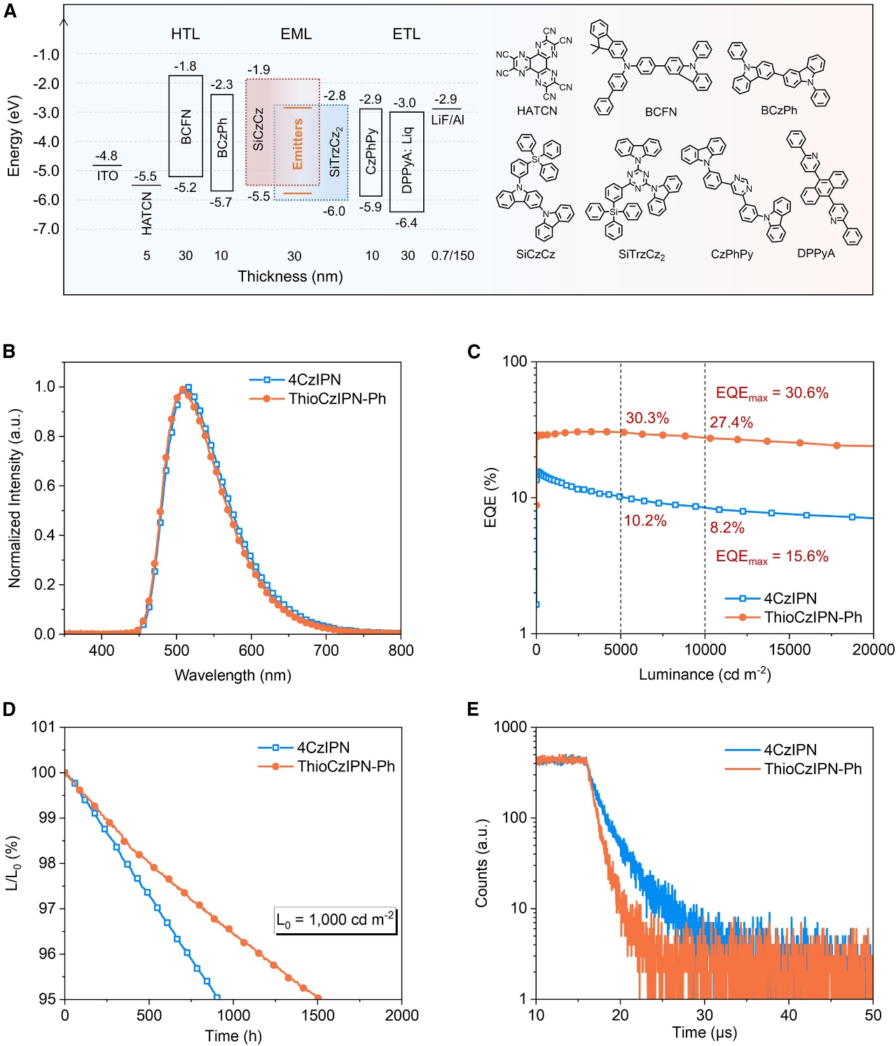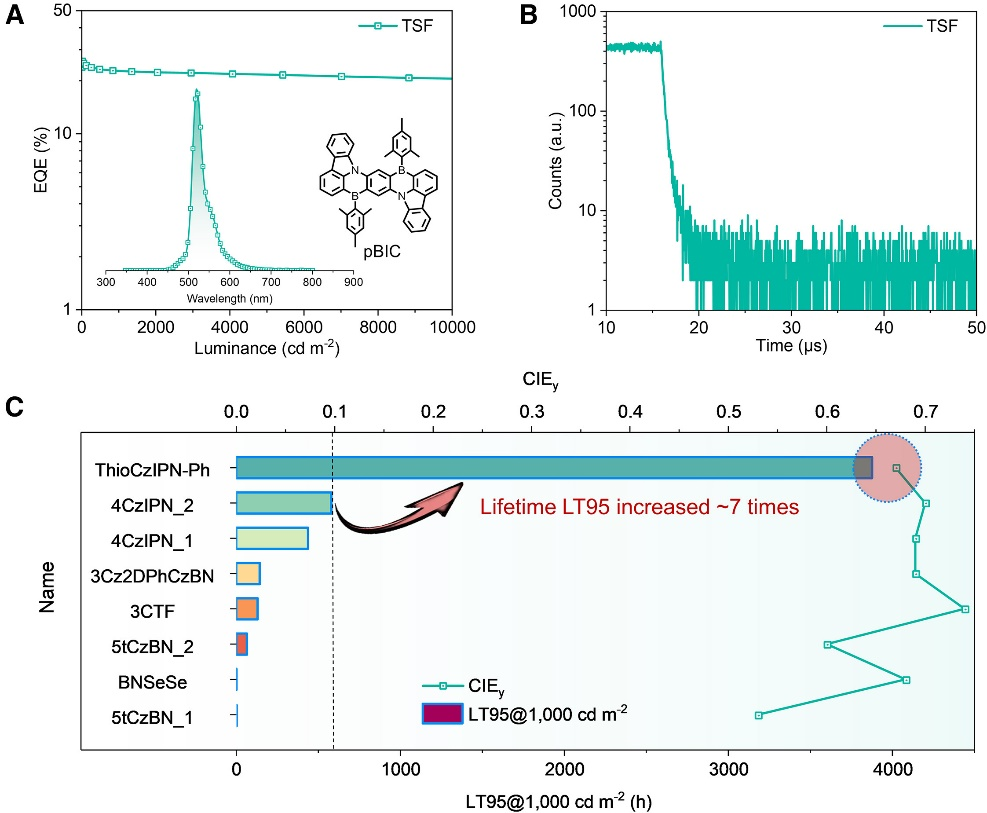 基于ThioCzIPN-Ph制备的TADF-OLED器件实现了30.6%的最大外量子效率(EQEmax),且得益于其快速的激子动力学过程,有效抑制了激子的淬灭,使得在高亮度下的效率滚降很小——5,000 cd m-2和10,000 cd m-2亮度下,EQE仍分别保持在30.3%和27.4%。该器件在1,000 cd m-2初始亮度下的LT95寿命(亮度衰减至95%所需时间)长达1,523小时,通过结合热活化敏化荧光(TSF)技术掺杂绿光窄光谱染料实现纯绿色发射(CIEy = 0.67),器件寿命进一步提升至3,876小时。