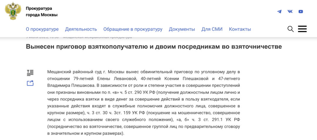 今年7月,莫斯科检察院发布消息,梅先斯基法院以受贿罪和诈骗罪,判处Levanova有期徒刑8年,缓刑5年,罚款200万卢布,并依法没收其违法所得的70.2万卢布,上缴国库。