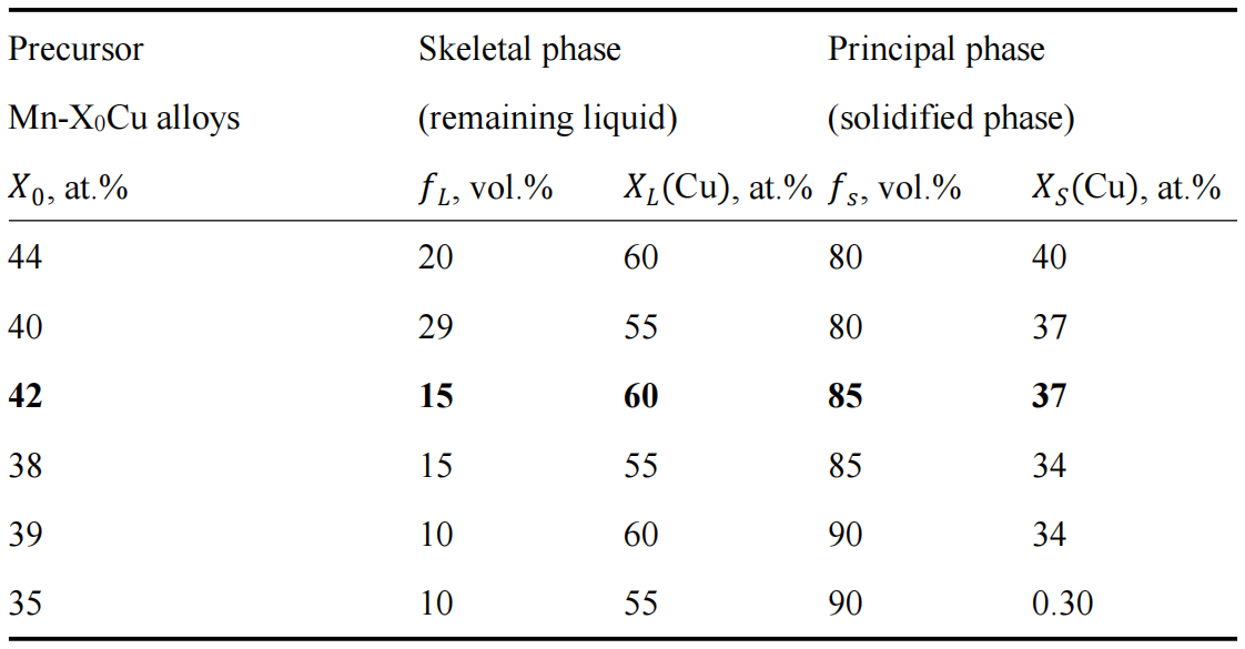 表1:不同Mn–Cu前驱体合金在快速凝固下的骨架相与主相成分预测。