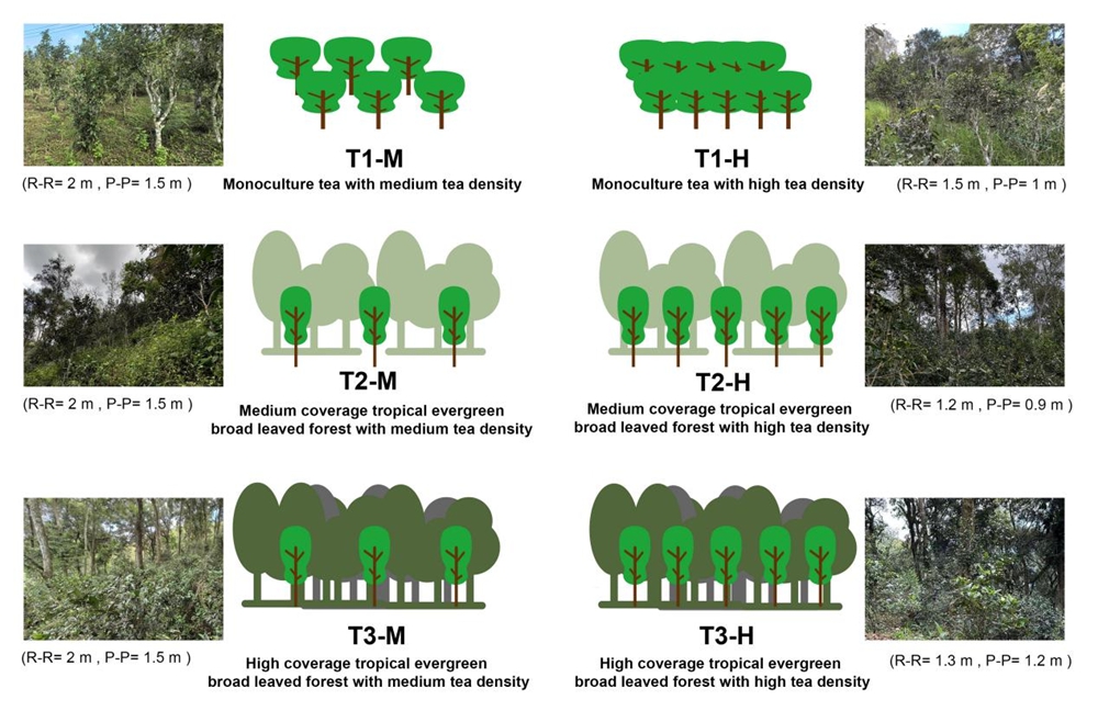 针对上述问题,中国科学院西双版纳热带植物园研究员宋亮团队等在云南省勐腊县象明乡安乐村古茶园开展了系统研究。研究人员采用科学实验设计,通过精细监测微气候、分析土壤养分及检测茶叶代谢物,深入解析了纯茶园、中覆盖森林茶园、高覆盖森林茶园生境类型与中密度、高密度两种种植密度对茶叶品质的影响机制。