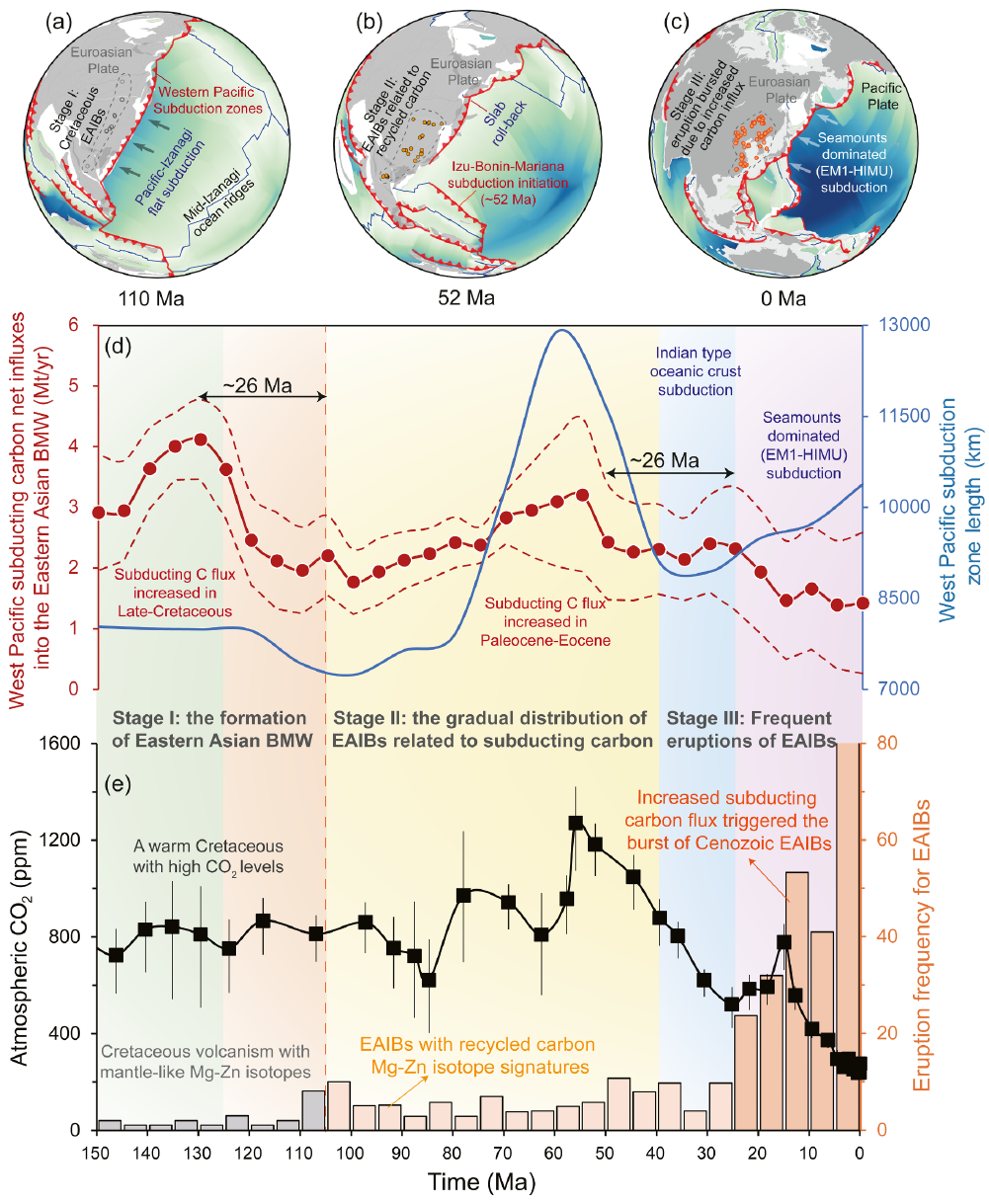 古地理重建模拟东亚大地幔楔俯冲碳通量变化。