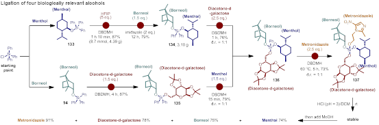 在概念验证中,团队仅用四步便完成药物分子的精准组装:将抗菌药甲硝唑、镇痛成分薄荷醇、天然产物冰片及糖分子通过硅原子三维集成。这种分子乐高构建的化合物在酸性条件下可解离回收各醇类模块。