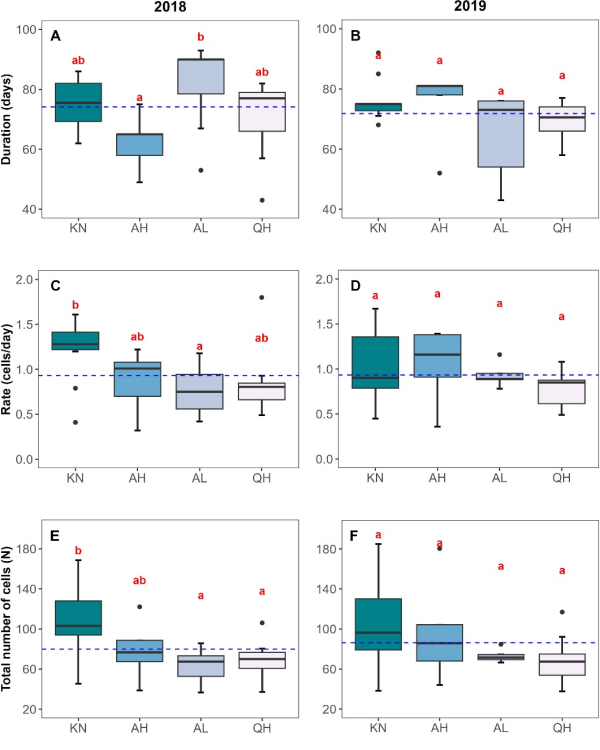 研究发现,在2018年,最温暖的AL拥有最长的树木木质部生长周期持续时间82.6±13.3天,但形成的木质部细胞数却最少,为63.88±15.6个,这表明生长季长度与木质部生长之间发生了解耦。这种解耦现象在2019年有所减弱,因为该年春季气温低于2018年,且夏季降水量高于2018年。春季气温升高可通过触发形成层活动提前开始,从而延长木质部细胞生产的持续时间。充足的夏季降水为膨压驱动的细胞分裂和扩张提供了必要的水分,提高了细胞生产率,这对干旱和半干旱森林的木材生长至关重要。因此,更温暖的春季气温可能放大所观察到的解耦现象,而充足的夏季降水则可能减弱它。这种解耦突显了季节性气候因素在调节干旱和半干旱森林木材形成动态中的关键作用。随着气候变化的持续,更长、更温暖的生长季可能放大水分可用性的重要性,在生长季水分条件不利时,将进一步限制森林生长和碳固存。
