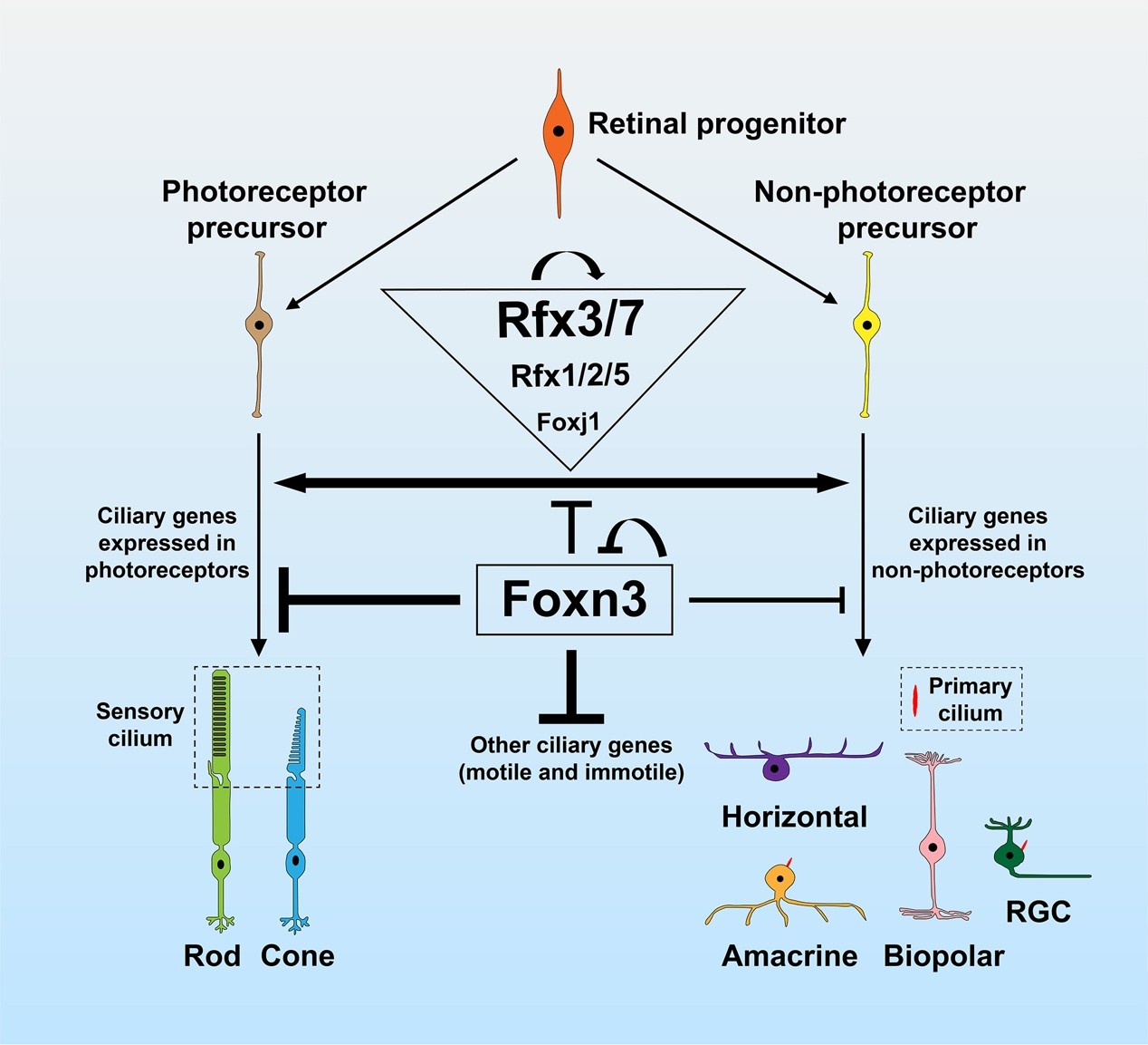 为揭示Foxn3调控视网膜纤毛发生的基因调控网络,研究团队应用ChIP、CUTTag和荧光素酶实验等手段证实:Foxn3作为纤毛基因的转录抑制因子,维持视网膜细胞纤毛分化的二元格局。Rfx家族转录激活因子(尤其是Rfx3和Rfx7)促进感光细胞感觉纤毛的形成,而Foxn3在出生后及成年视网膜中特异表达于非感光神经元,通过双重机制抑制纤毛发生:既直接抑制纤毛基因表达,又通过抑制Rfx基因和Foxj1间接阻断纤毛形成通路。