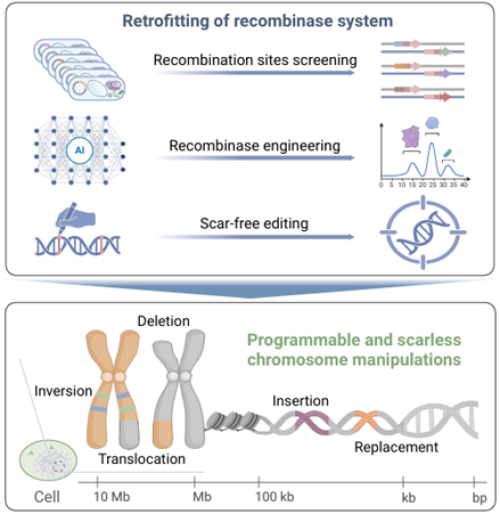 位点特异性重组酶Cre-Lox系统具有染色体水平DNA操纵潜力,但其应用受到三个关键问题制约:Lox位点固有的对称性导致重组反应可逆,不利于目的编辑发生;Cre酶作为四聚体工作,提升其活性的工程改造难度高;重组后特异性位点残留,影响编辑的精准性。为突破上述限制,研究团队构建了系统性技术路径。团队开发出高通量重组位点快速改造平台,并提出不对称Lox位点设计原则,创制新型Lox变体,其可逆性重组活性降低至接近阴性对照水平,同时保持其原有的高效正向重组能力。进一步,基于团队此前自主开发的融合蛋白通用逆折叠模型、结构与进化约束信息的蛋白定向进化平台AiCE,实现对Cre蛋白多聚化界面的精准优化,获得重组效率提升至3.5倍的工程化Cre蛋白变体。团队创建并优化了重组酶的无痕编辑策略Re-pegRNA,利用引导编辑器的高效编辑特性,通过设计特异性pegRNA对重组后残留的Lox位点进行“重引导编辑”,将其精准替换为原有基因组序列。