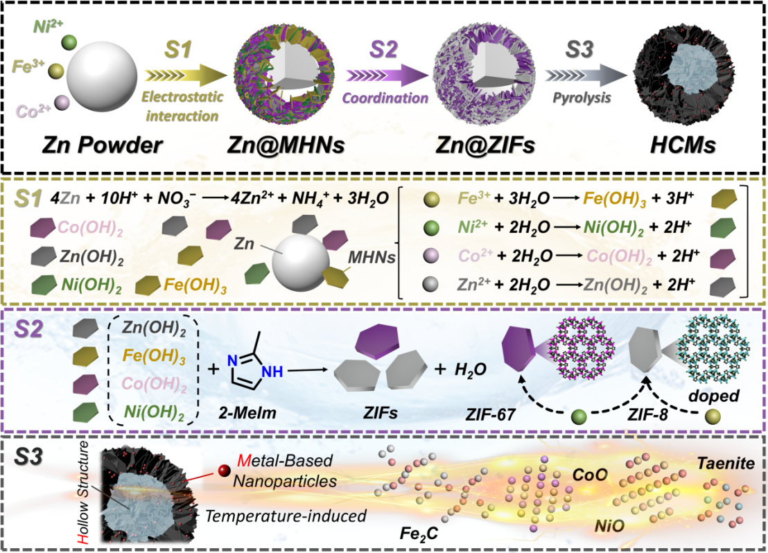 基于双钝化抗腐蚀效应,研究团队通过自牺牲模板辅助法制备了具有优异电磁波吸收和耐腐蚀性能的空心碳微球(HCMs)。通过Zn微球还原特性和热驱动协同调控磁性微球的磁畴演变,优化了异质界面共振,实现了强磁耦合,使其最小反射损耗低于-4dB,有效吸收频带宽度大于5GHz。制备的HCMs表面呈电负性,可通过静电排斥减少腐蚀离子(Cl-、OH-等)在基材表面的吸附/积累,有效降低导电能力,从而缓解腐蚀过程,实现短时间内的防腐特性。另一方面,随着浸泡时间的增加,磁性颗粒相继转化为层状双氢氧化物(LDHs),通过强阴离子捕获能力进一步阻止腐蚀离子接近基底表面,从而实现长效防腐效果。(来源:中国科学报 李媛)
