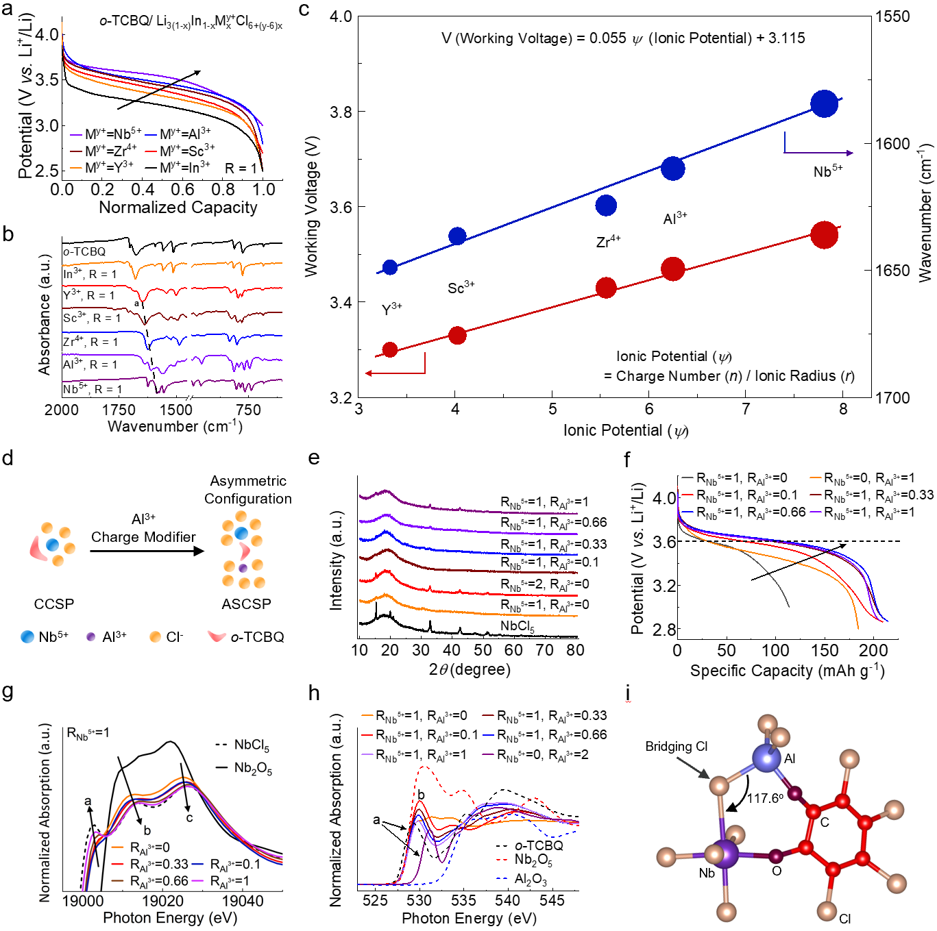 图2系统展示了通过引入不同金属阳离子调控o-TCBQ工作电压的策略:随着固态溶剂化结构中的金属阳离子极化势(ψ)从Y3+、Zr4+逐步提升至Nb5+,o-TCBQ的电压显著提高,C=O红移增强,呈现出良好的线性关系。然而Nb5+虽极化能力最强,但因溶解性差难以形成高效ASCSP结构。为此,作者引入高溶解性的Al3+协同Nb5+形成Nb–Cl–Al异核异配结构,构建非对称ASCSP溶剂化壳层,在维持溶解性的同时显著提升分子极化与电子转移能力,最终将o-TCBQ电压提升至对锂金属3.6 V。