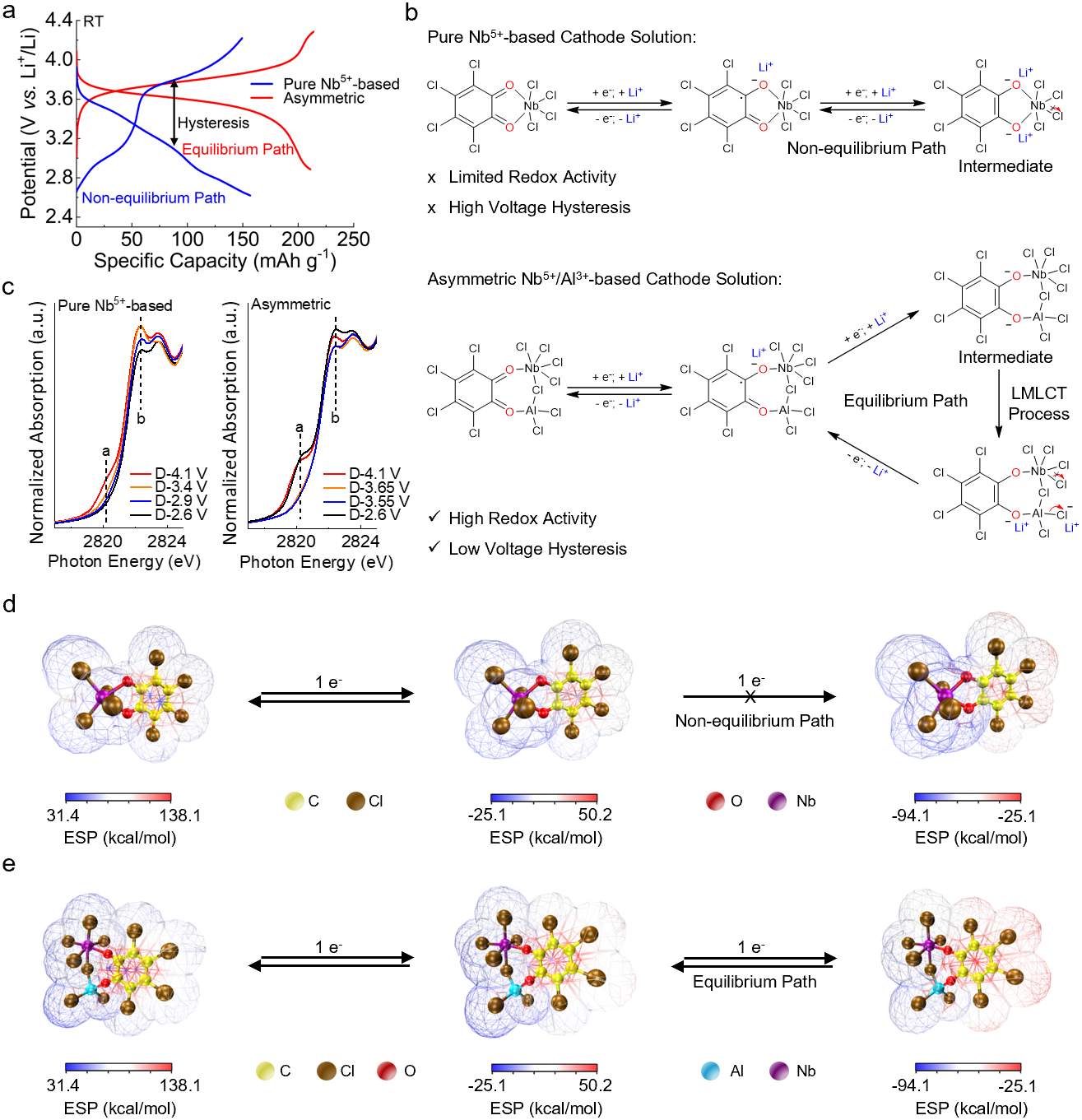 图3揭示了异核Nb5+/Al3+溶剂化结构为何能显著提升o-TCBQ的电化学性能:相比于纯Nb5+体系中d轨道易饱和、电子堆积造成放电过程中o-TCBQ的还原中断以及大的电压滞后,异核结构激活了配体-金属-配体电荷转移(LMLCT)路径,使局部富集的电子转移至Al配位的无机Cl–配体,有效释放局部电荷密度,降低电压滞后(700→180 mV)、提升两电子反应活性与可逆性,实现平衡而高效的还原反应。