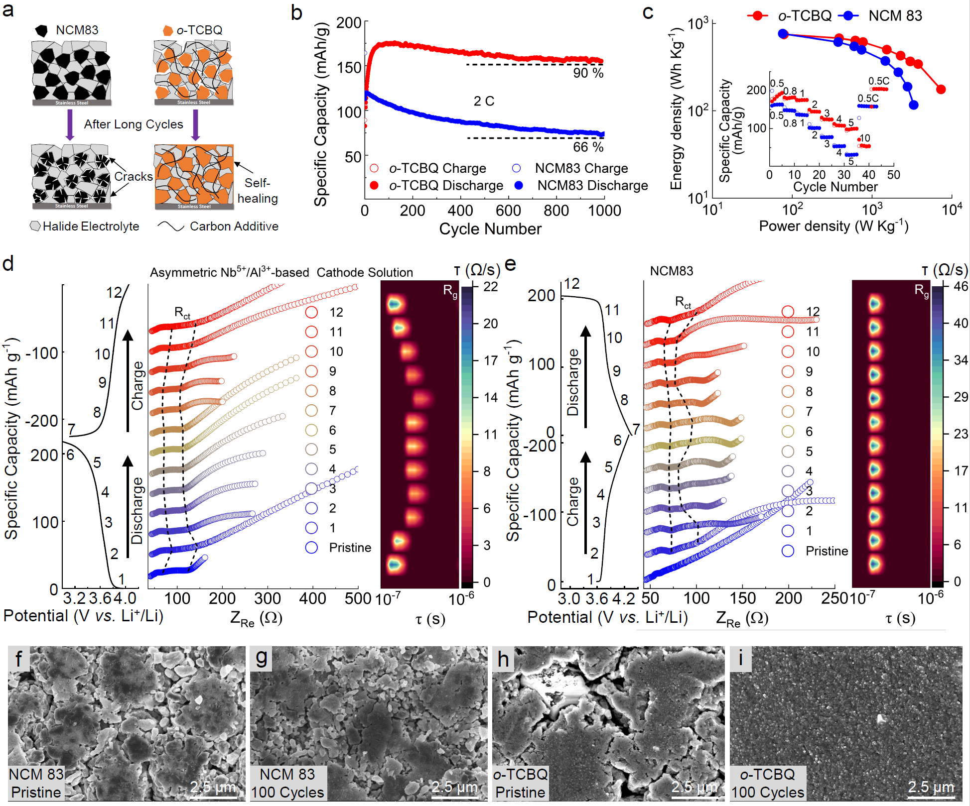 图5揭示了Nb5+/Al3+异核结构赋予电极界面自愈合能力:相比刚性层状氧化物如NCM83在低堆压下易产生界面断裂、电阻上升,该固态阴极溶液体系在循环过程中界面电阻反而持续下降(由180Ω降至20Ω),表现出良好的离子渗透性与界面重构特性;原位EIS/DRT与SEM/EDS结果证实o-TCBQ可在充放电中动态渗入电解质晶界,修复裂纹、增强接触,实现低压稳定运行与全固态电池的长寿命。
