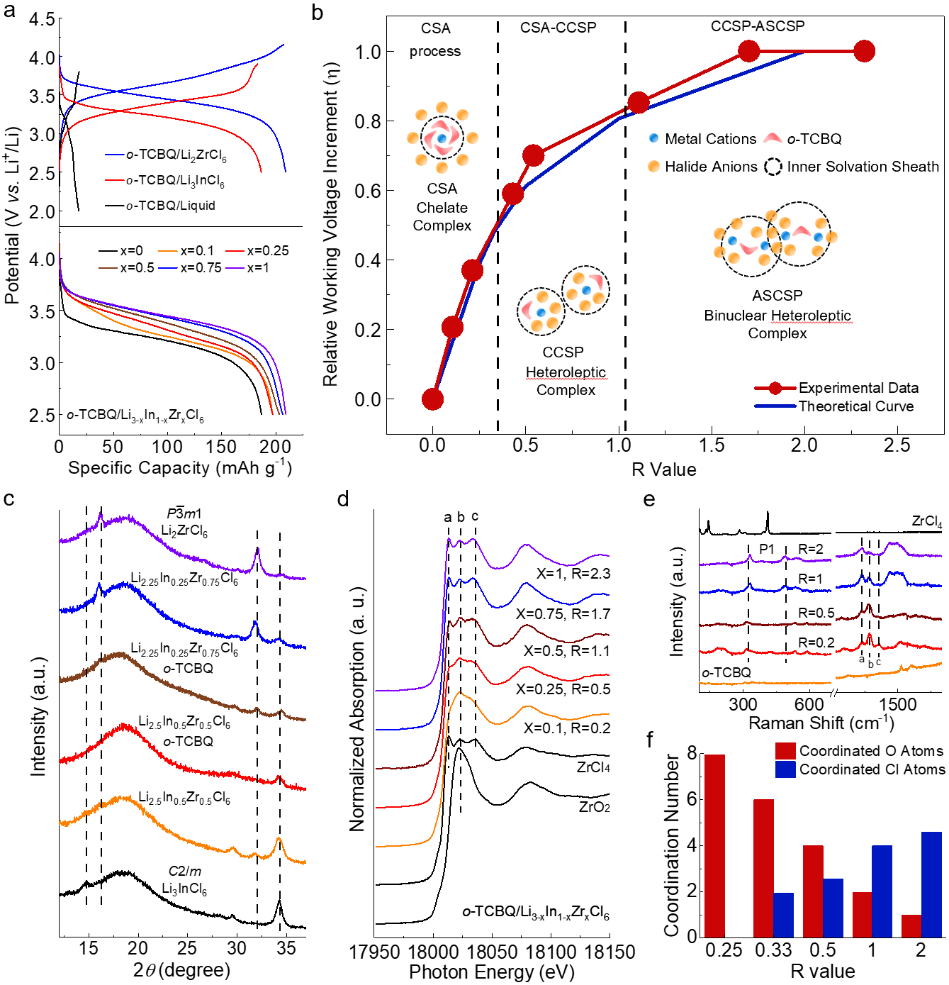 如图1所示,通过对氯化物固体电解质中In3+/Zr4+离子混合比的系统调控,研究人员发现o-TCBQ工作电压与Zr4+离子浓度高度相关。结合XRD、XAS、拉曼、红外等手段,确立了随着Zr4+离子浓度增加溶剂化结构从CSA → CCSP → ASCSP的演化模型。随着Zr4+离子进入有机相,其与o-TCBQ中C=O氧化还原中心逐步形成多中心配位,诱导电子从有机骨架向Cl配体偏移,从而提升氧化还原电位。研究人员通过研究o-TCBQ与不同浓度Zr4+离子的配位的电化学行为为后续高压设计打下理论基础。