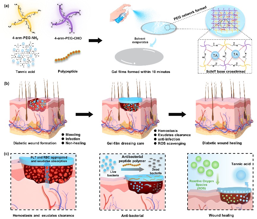 针对以上挑战,研究团队基于四臂聚乙二醇和单宁酸,设计了一种可喷涂-蒸发制备的动态交联双网络结构水凝胶薄膜敷料,并通过负载具有广谱高效抗菌活性和良好生物安全性的β-氨基酸聚合物,制备了具有高效抗菌活性、抗氧化、止血和渗出液清除能力的水凝胶薄膜敷料。