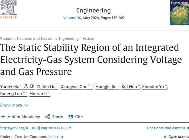 论文信息:Yunfei Mu, Zhibin Liu, Xiangwei Guo, Hongjie Jia, Kai Hou, Xiaodan Yu, Bofeng Luo, Hairun Li. The Static Stability Region of an Integrated Electricity-Gas System Considering Voltage and Gas Pressure. Engineering, 2024, 36(5): 132–145 https://doi.org/10.1016/j.eng.2023.12.009