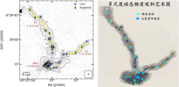 左:目标区域I18308中的HFS形态结构特征以及云核间距的分布。该HFS分子云由两条独立丝状结构和中心hub团块构成。右:多尺度动态物质吸积艺术图。