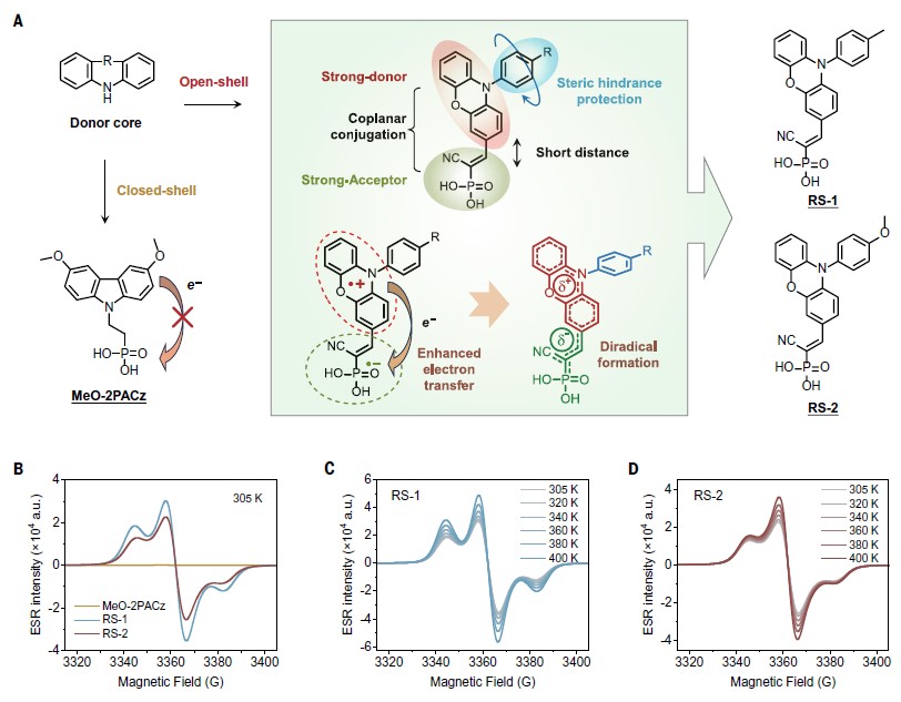 最新研究中,中国科学院长春应用化学研究所研究员秦川江团队设计并合成出稳定的给体-受体型自组装分子(RS-1和RS-2):以含氮杂环为电子给体,氰基磷酸为电子受体,利用短距离的强推拉电子作用增强了电子离域效应,在聚集态下促进了分子内和分子间的电荷转移,进而促进了醌式-双自由基及正负离子对共振式的形成。通过在分子的氮杂环上引入大位阻芳环,进一步提升了双自由基的光、热及电化学稳定性,利用电子自旋共振等测试手段证实了RS-1和RS-2具有本征的开壳-双自由基特性,同时展示出聚集诱导自由基效应及显著提高的导电性。