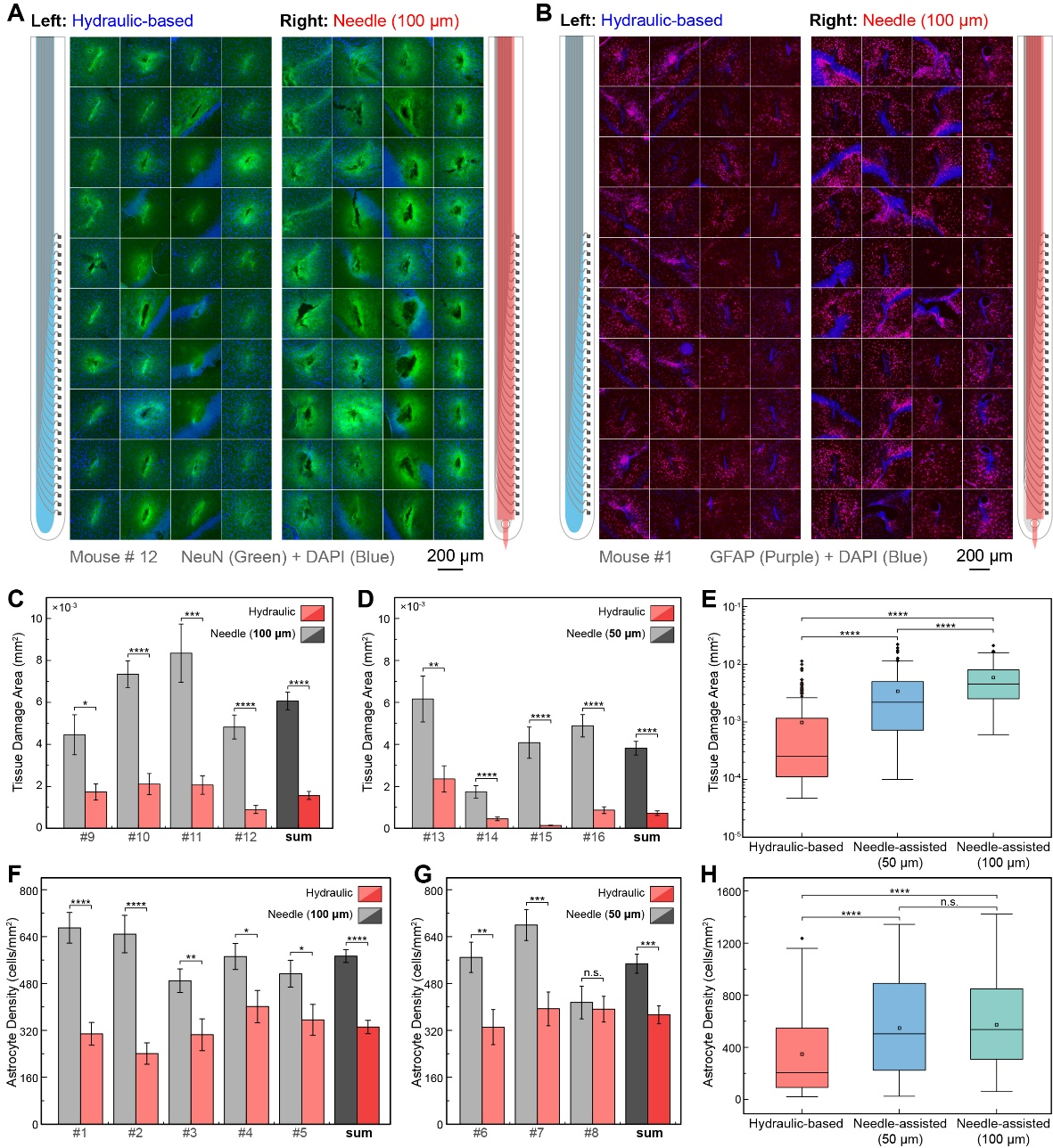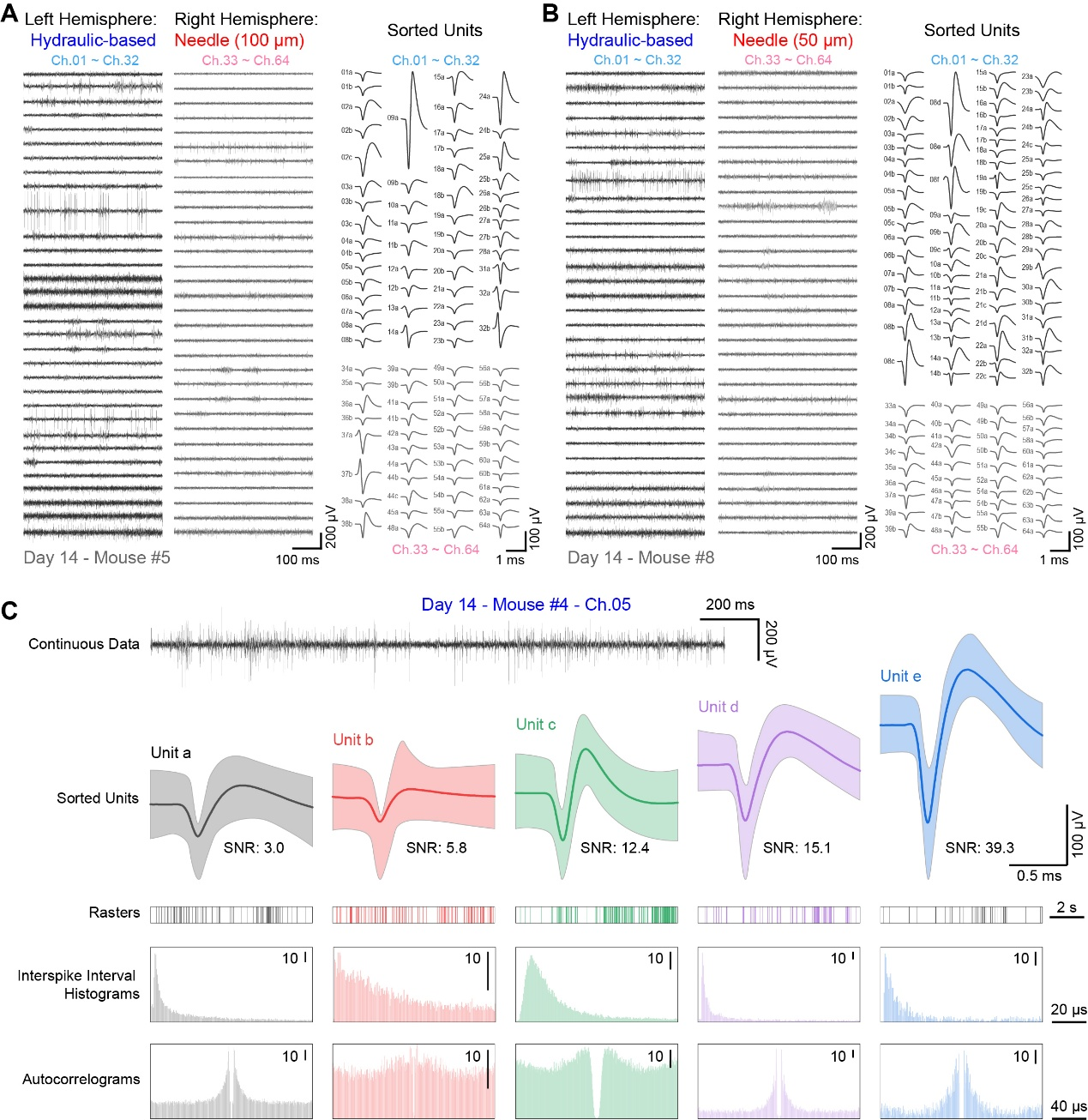 针对上述问题,中国科学院半导体研究所研究员裴为华团队联合心理研究所研究员梁璟团队,研发出刚柔可调的“神经触手”式神经探针。该探针通过微型液压系统调控内部压力,能在插入阶段变得刚硬,并精准穿刺脑组织,且植入完成后可恢复柔软状态,以适应脑组织微环境。这一方案在无需借助硬质导入工具的情况下,实现了低损伤植入与长期高质量神经信号记录的双重目标。实验证实,相较于传统方法,该技术可显著降低急性损伤超74%、减轻慢性免疫反应约40%,且在小鼠长期在体记录中始终保持优异的神经元信号质量与信噪比,信号通道的功能性和单位数量均显著优于对照组。