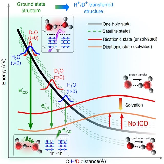 近期,中国科学院物理研究所的张鹏举特聘研究员与捷克布拉格化工大学的Petr Slavícek教授以及苏黎世联邦理工学院 (ETH Zurich) 的Hans Jakob Wörner教授合作,通过将高次谐波过程产生阿秒脉冲串,并进行单色化,结合真空液体微束技术和高分辨光电子谱仪,构建了一种全新的液相样品光电子-自电离电子符合测量方案(图1b,d),发现水(H2O)和重水(D2O)的2a1轨道被光电离之后,均能发生ICD过程,并产生低能ICD电子(图1a)。通过进一步对比二者的相对效率,结合高精度第一性原理计算,并模拟溶剂化效应对上述超快能量退激过程的影响,发现ICD过程并不是唯一的能量退激通道,其还与超快质子转移(Proton transfer, PT)和非绝热过程存在竞争关系,后者能够关闭ICD通道并产生自由基。该研究成果不仅从实验上确认了液体水中存在ICD过程,还发现了核运动对液体水ICD过程的重要影响,进一步加深了人们对高激发态液体水退激动力学的理解(图2)。