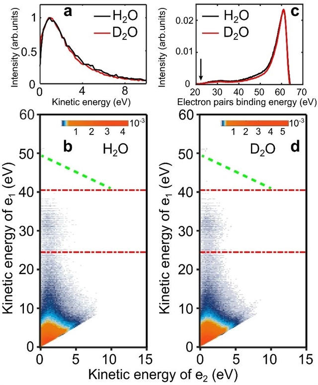 图1. (a) 水(H2O)和重水(D2O)的ICD电子能谱. (b,d) 水(H2O)和重水(D2O)的电子-电子符合能谱分布. (c) 水(H2O)和重水(D2O)的电子对能谱分布。